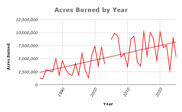Another effect of Smokeys fire suppression initiative was the delayed INCREASE in wildfire severity and frequency. This is the result of astronomical buildup of biological litter in natural areas: regular controlled burning removes dried leaf litter, grass stems, and smaller woody stems. It also thins the understory plants and reduces fuel ladders (which, fuel ladders sounds cool, but think of it this way: dense stands of trees in all different sizes = fire can easily climb up shorter trees into taller trees, leading to devastating canopy fires that are pretty much impossible to stop without crews of helicopters slinging foamy water and dropping brave firefighters into the wilderness). So yeah, with regular controlled fires, these fire fuels get burned away before they have a chance to significantly build up… But when fire suppression became the name of the game, these fuels built up for DECADES and forest understories became overly dense with growth - in turn reducing water availability/increasing drought conditions (Steel & Jones, 2022). So now, when your neighbor trevor flicks his cig into the woods or trish's baby's gender reveal fireworks go off in the wrong direction, there's an abundance of crispy dried plant fuels just ready to light up and burn away millions of acres (Fig. 1). That's right, each year, MILLIONS of acres are burned in severe wildfires that are bigger and hotter than ever due to excess fuel buildup (Joyce, 2012; National Interagency Fire Center Dataset, 2025). And you know who helped make that possible? Smokey the Bear.